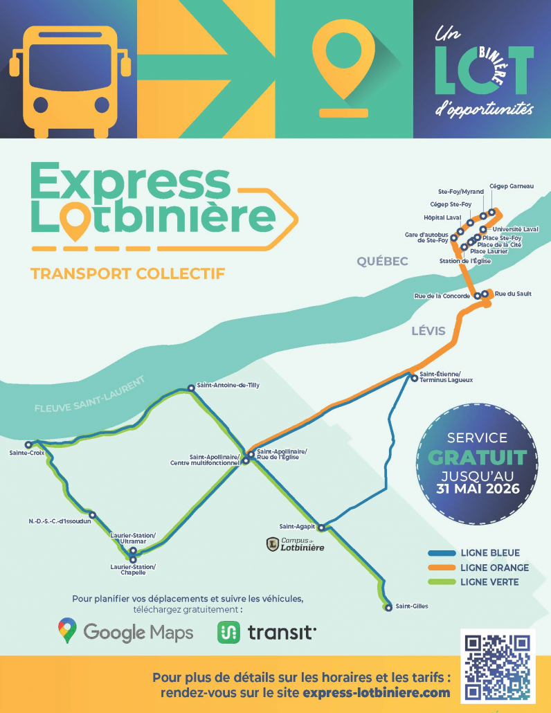 Express Lotbinière est un service de transport collectif qui facilite les déplacements des résidents de la MRC de Lotbinière, à l’intérieur et à l’extérieur du territoire, grâce à ses services sur ligne fixe et à la demande (Express Taxi).